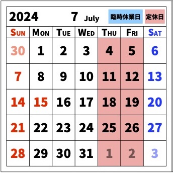 7月の営業カレンダーです